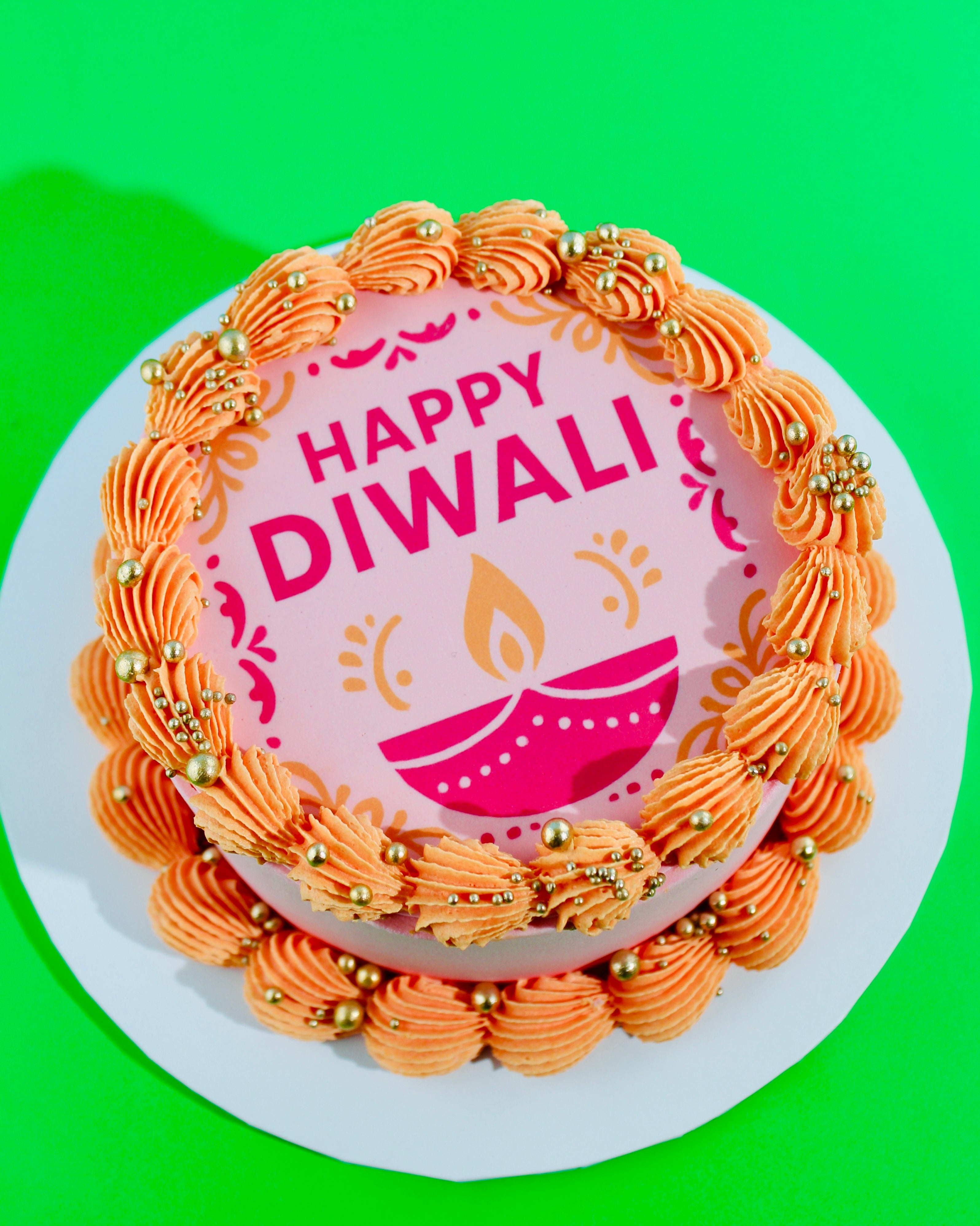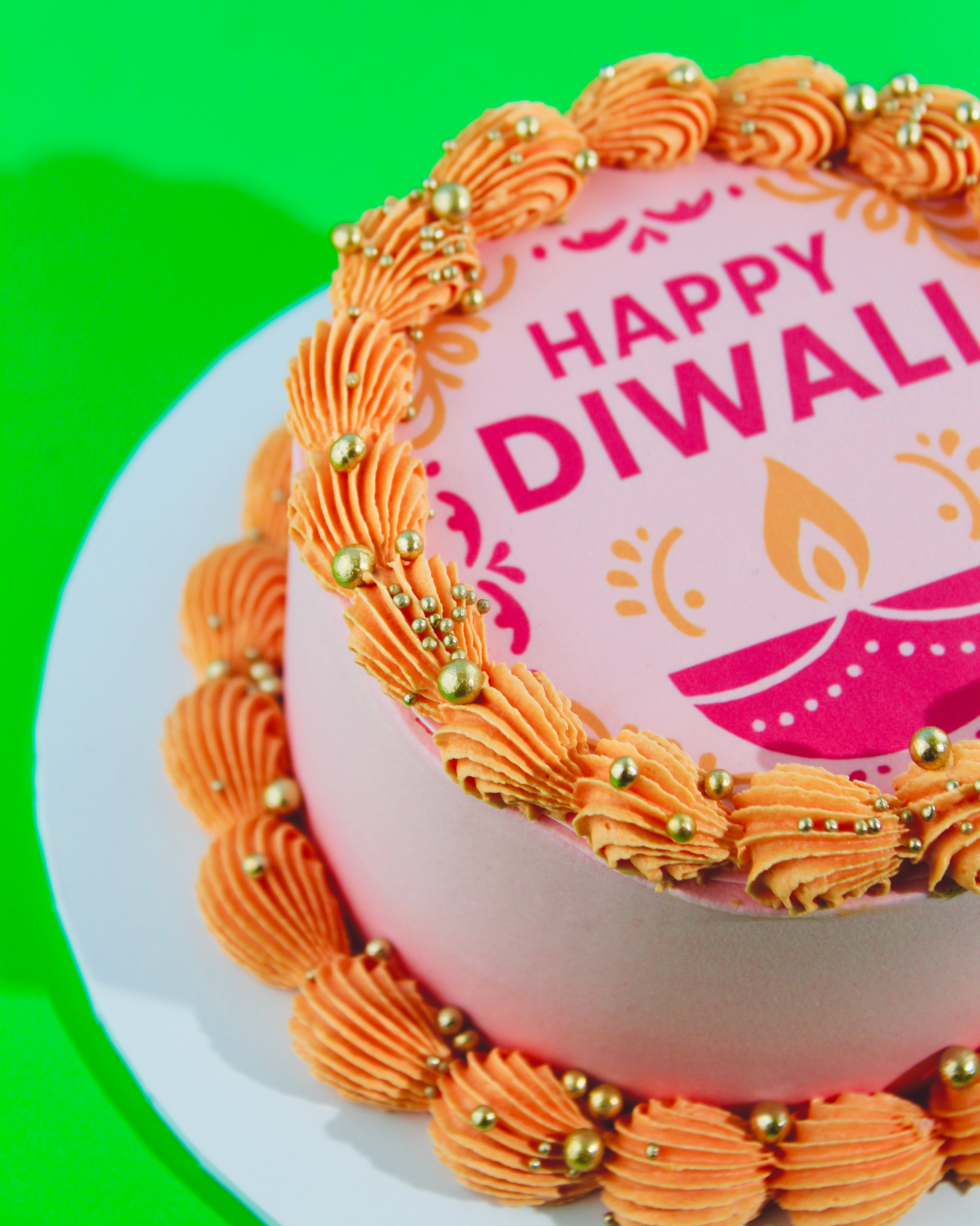 Each bake is handcrafted with care, featuring edible rangoli and diya designs, luxurious buttercream piping, and your choice of sponge and filling.